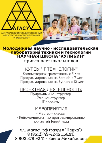 Обучение в детской научной школе АГАСУ «Кулибин» расширяет кругозор, развивает творческие способности, наглядно-образное мышление, а также воспитывает мотивацию к труду и закладывает основы востребованных в современном обществе профессий.