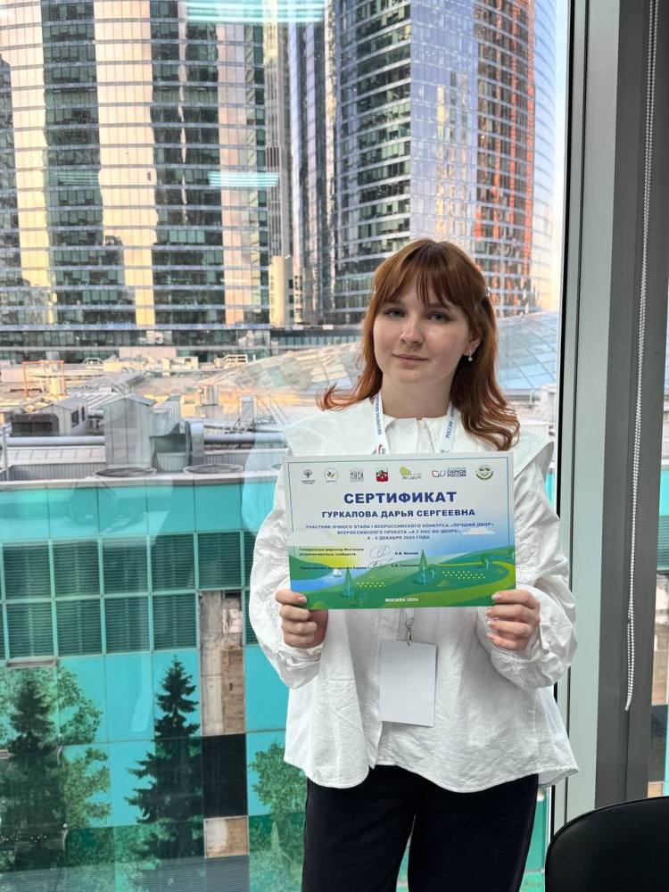 6 декабря 2024 г. пятикурсница направления «Дизайн архитектурной среды» Дарья Гуркалова приняла участие в заключительном этапе I Всероссийского конкурса «Лучший двор», реализованного при поддержке Министерства строительства и жилищно-коммунального хозяйства России. Мероприятие проходило в рамках Всероссийского проекта «А у нас во дворе» на базе Московского гуманитарно-технологического университета – Московского архитектурно-строительного института.