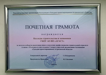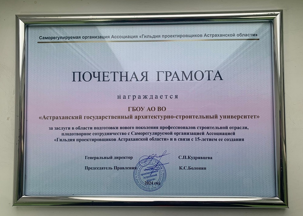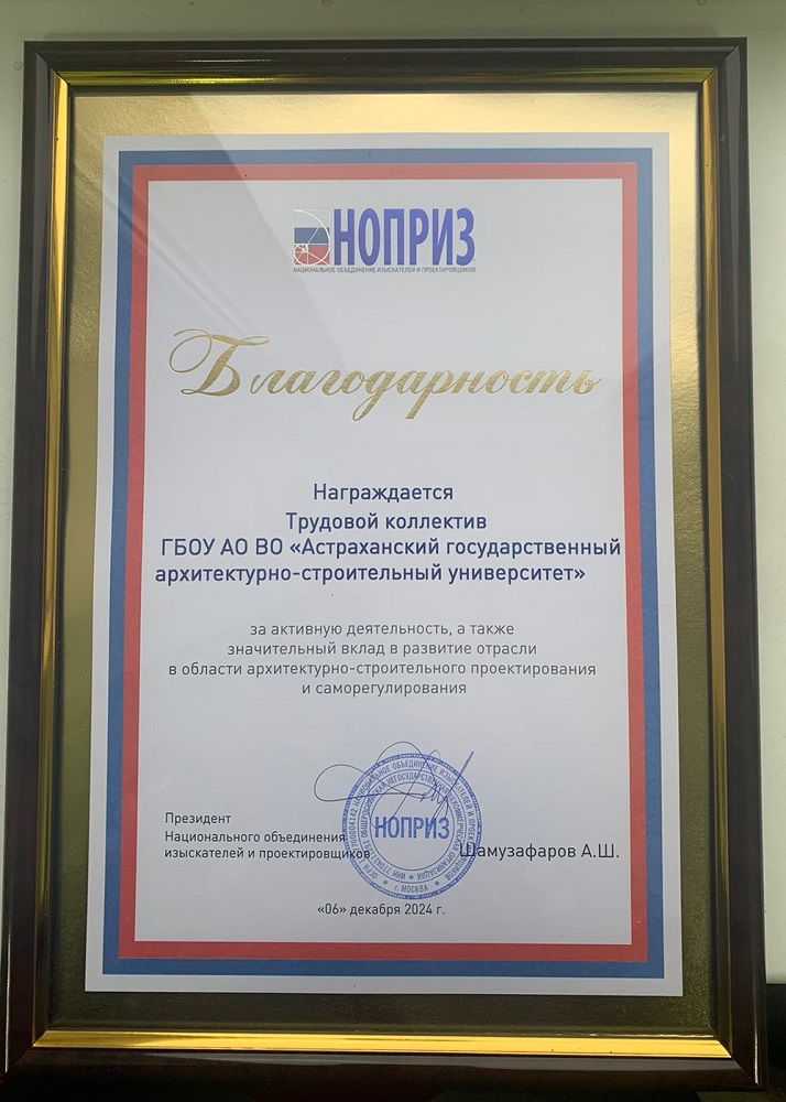 АГАСУ был удостоен почетных грамот за заслуги в области подготовки нового поколения профессионалов строительной области, а также трудовой коллектив вуза получил благодарственное письмо НОПРИЗ за активную деятельность и значительный вклад в развитие отрасли проектирования и саморегулирования.