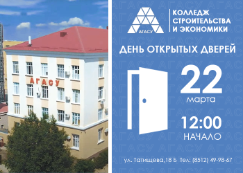 22 марта 2025 г. в 12:00 в актовом зале второго корпуса Астраханского государственного архитектурно-строительного университета пройдет день открытых дверей. Приглашаем на него будущих абитуриентов (учащихся 8–11 классов), их родителей и всех заинтересованных лиц.