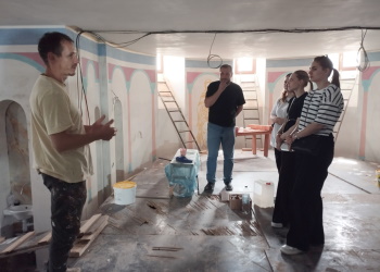 Будущие специалисты познакомились с работой мастеров из Ивановской области, которые в настоящее время расписывают нижний придел храма. Александр Голубев, руководитель художественной мастерской с большим опытом работы, рассказал начинающим архитекторам-реставраторам о пути профессионального становления и основах монументальной живописи. Художники также поделились информацией об используемых материалах, технологиях, способах и этапах нанесения росписи на стены и своды.