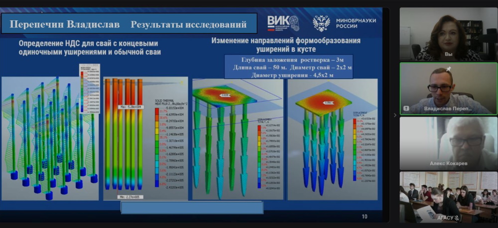 Модератор мероприятия, заведующая лабораторией междисциплинарных научных исследований АГАСУ, доцент кафедры «Строительные конструкции, здания и сооружения» РУТ (МИИТ) Наталья Купчикова рассказала, что в этом году на пленарном заседании выступили молодые исследователи, которые стали призерами и лауреатами престижного Всероссийского инженерного конкурса выпускных квалификационных работ в области проектирования и строительства. Так, финалист состязания Владислав Перепечин представил результаты своей научной работы на тему «Проектирование свайно-плитных фундаментов, в том числе с уширениями для условий арктической зоны» (РУТ МИИТ), а Александр Бекиров, полуфиналист, рассказал о проекте «Обеспечение светового, акустического и теплового комфорта строительными и инженерными решениями гостиничной недвижимости» (НИУ МГСУ).