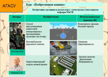 Школа инновационного консалтинга при кафедре экспертизы, эксплуатации и управления недвижимостью АГАСУ работает с 2018 г. За семь лет прошли подготовку 12 молодых исследователей, которые стали авторами 27 изобретений.