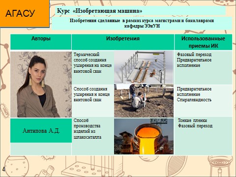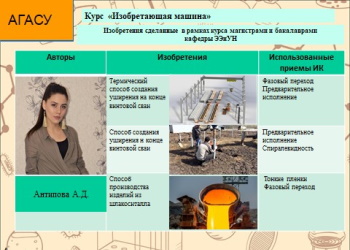 В рамках преподаваемого курса каждый слушатель создает одно или несколько изобретений. Так, выпускница профиля «Экспертиза и управление недвижимостью» Алина Антипова разработала три проекта, а Евгений Купчиков – два. Результаты интеллектуальной деятельности отражены в выпускных квалификационных работах.