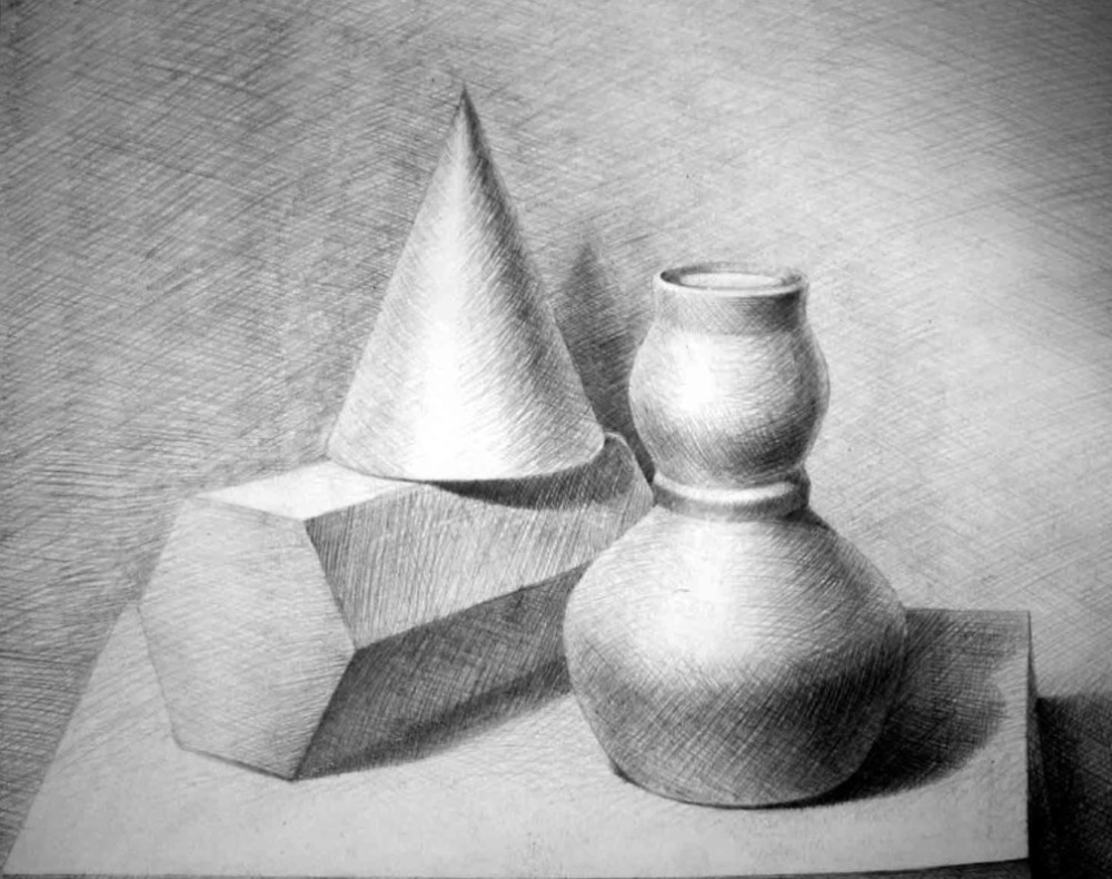 Ребятам предстоит нарисовать натюрморт из геометрических фигур, закомпоновать их в заданном формате, выполнить построение и легкую светотональную проработку.